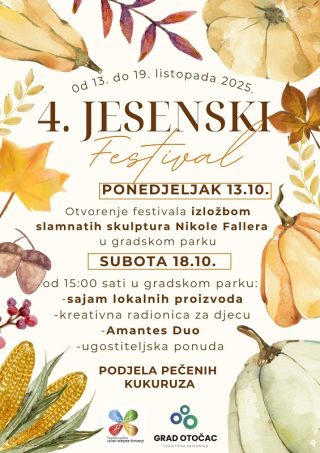 Objavljeno: 07/10/2025OTOČAC- Iz Otočca će se i ove godine poslati najljepše jesenske razglednice. Od 13. do 19. listopada 2025. održava se 4. Jesenski festival u Otočcu, manifestacija koja spaja umjetnost, kreativnost, domaće proizvode i veselu atmosferu. Festival započinje u ponedjeljak, 13. listopada, otvorenjem izložbe slamnatih skulptura renomiranog umjetnika i akademskog kipara Nikole Fallera iz Osijeka, poznatog po radu svoje udruge „Slama Land Art“. Njegove impresivne kreacije od prirodnih materijala već su oduševile brojne posjetitelje diljem Hrvatske, a ove će jeseni ponovno krasiti i gradski park u Otočcu, donoseći jedinstven spoj tradicije i suvremene umjetnosti. Glavni festivalski dan bit će subota, 18. listopada, kada će se održati sajam lokalnih proizvoda – prilika da se kušaju i kupe domaći specijaliteti, rukotvorine i autohtoni proizvodi Gacke. Uz to, za najmlađe je pripremljena kreativna radionica s jesenskim motivima. Sve će biti popraćeno zvucima Amantes Dua, koji će svojim ritmovima zabavljati i rasplesati posjetitelje. Naravno, neizostavan dio jesenskog ugođaja bit će i miris pečenih kukuruza, kojima će se svi moći počastiti tijekom dana. Jesenski festival u Otočcu organizira TZ Grada Otočca, a ove godine manifestaciju sufinancira i TZ Ličko-senjske županije.