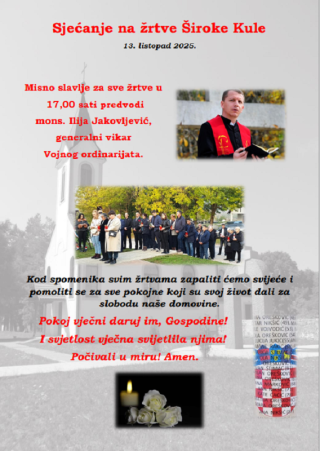 Objavljeno: 13/10/2025GOSPIĆ- Danas se obilježava tužna 34. godišnjica stradavanja mještana Široke Kule i okolnih mjesta u Domovinskom ratu. U 17 sati bit će služena Sveta misa u Župnoj crkvi Sv. Mateja ap. u Širokoj Kuli, koju će predvoditi generalni vikar Vojnog ordinarijata mons. Ilija Jakovljević. Nakon mise održat će se polaganje vijenaca, paljenje svijeća i komemoracija kod Spomen obilježja žrtvama II. svjetskog i Domovinskog rata u Širokoj Kuli.