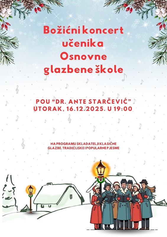 Objavljeno: 13/12/2025GOSPIĆ- U ovo adventsko vrijeme i učenici Osnovne glazbene škole koja djeluje pri Osnovnoj školi dr.Jure Turića žele svoje sugrađane počastiti koncertom. Na programu će biti skladatelji klasične glazbe, te tradicijske i popularne pjesme. Kako to mladi Gospićani sviraju pogledajte i poslušajte u utorak, 16.prosinca od 19 sati u Pučkom otvorenom učilištu dr.Ante Starčević.