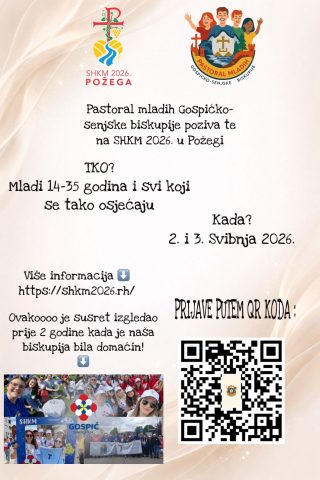 Objavljeno: 11/03/2026Pastoral mladih Gospićko-senjske biskupije poziva mlade na Susret hrvatske katoličke mladeži (SHKM) 2026. koji će se održati 2. i 3. svibnja 2026. godine u Požegi.