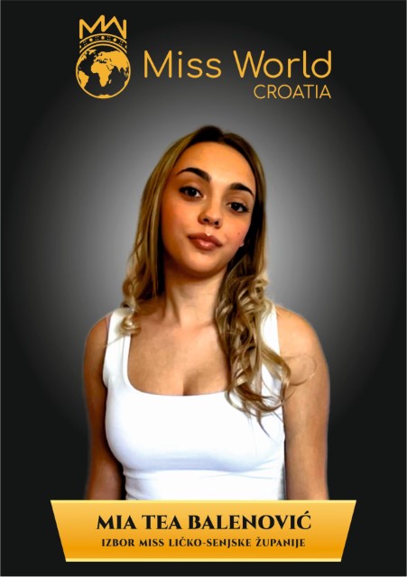 - MIA TEA BALENOVIĆ -Ima 17 godina, dolazi iz Smiljana i visoka je 165 centimetara. Pohađa četvrti razred Srednje škole za medicinske sestre/tehničare opće njege u Gospiću. Mia Tea voli čitati knjige i sudjeluje na nacionalnoj razini kviza “Mreža čitanja”. U slobodno vrijeme najviše voli planinariti i družiti se s prijateljima. Govori njemački jezik.
