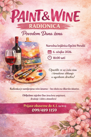 Objavljeno: 22/02/2026PERUŠIĆ- Povodom obilježavanja Međunarodnog dana žena, Narodna knjižnica Općine Perušić organizira kreativnu radionicu „Paint and Wine“, koja će se održati u petak, 6. ožujka 2026. godine s početkom u 18 sati u prostoru Općine Perušić (vijećnica). Riječ je o opuštenoj i kreativnoj radionici namijenjenoj svim ženama, bez obzira na prethodno slikarsko iskustvo. Sudionice će imati priliku izraziti svoju kreativnost kroz slikanje uz ugodno druženje i čašu vina. Cilj radionice je obilježiti Dan žena na poseban način, kroz umjetnost, druženje i stvaranje pozitivne atmosfere. Pozivamo sve zainteresirane žene da nam se pridruže i provedu ugodnu večer u kreativnom okruženju. Molimo zainteresirane da se prijave do 4. ožujka na broj 099/489-1159 ili u Narodnoj knjižnici Općine Perušić.