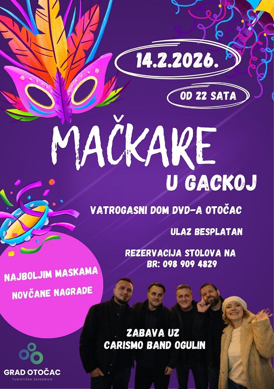 Objavljeno: 14/01/2026OTOČAC- Veljača je vrijeme smijeha, veselja i maštovitih maski, a najluđe i najšarenije doba godine ni ove godine neće proći bez omiljenih Mačkara u Gackoj. Turistička zajednica grada Otočca i ove godine poziva sve željne dobre zabave, plesa i kreativnih maski da se pridruže ovom tradicionalnom događanju. Mačkare će se održati u subotu, 14. veljače 2026. godine, s početkom u 22:00 sata, u dvorani Vatrogasnog doma DVD-a Otočac. Za vrhunsku atmosferu i ples do ranih jutarnjih sati pobrinut će se Carismo band iz Ogulina, koji jamči nezaboravnu večer ispunjenu dobrim ritmom i zabavom. Poseban poticaj svima koji vole maštovite i originalne maske svakako su novčane nagrade koje očekuju najbolje i najkreativnije sudionike. Maske kao i ostali gosti mogu si rezervirati stol u dvorani na broj mobitela 098 909 4829. Turistička zajednica grada Otočca poziva sve generacije da se maskiraju, opuste i zajedno proslave mačkarano ludilo jer – Mačkare u Gackoj su događaj koji se ne propušta!