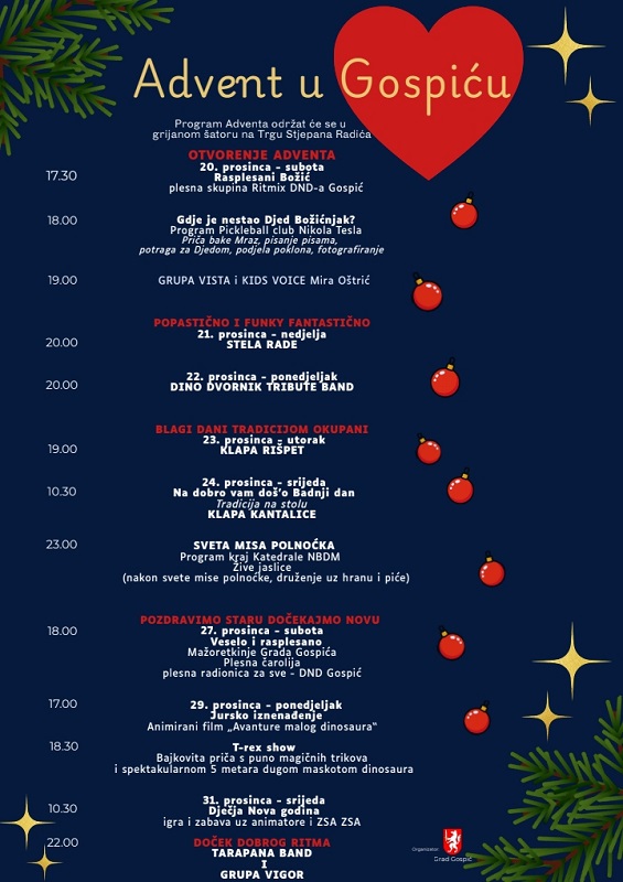 Objavljeno: 07/12/2025GOSPIĆ- “Advent u Gospiću” ove godine u vremenu uoči blagdana donosi mnoštvo glazbenih i zabavnih sadržaja, a posebno onih koji će razveseliti najmlađe. Otvorenje je u subotu 20. prosinca uz Grupu Vista i finalisticu Kids Voicea Miru Oštrić, dolazak djeda Mraza, pisanje pisama njegovoj družici baki Mraz i mnoge druge aktivnosti namijenjene djeci.