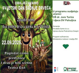 Nakon predstave u prisustvu djece u parku kraj Učilišta zasaditi ćemo dva „sretna drva“ te tako povezati kulturu i prirodu u obilježavanju Svjetskog dana sadnje drveća. Zajedno ćemo uljepšati malu zelenu oazu kraj zgrade Pučkog otvorenog učilišta a posađena stabla biti će i stalni podsjetnik djeci koja su ga zasadila na važnost drveča u očuvanju našeg zdravog okoliša.