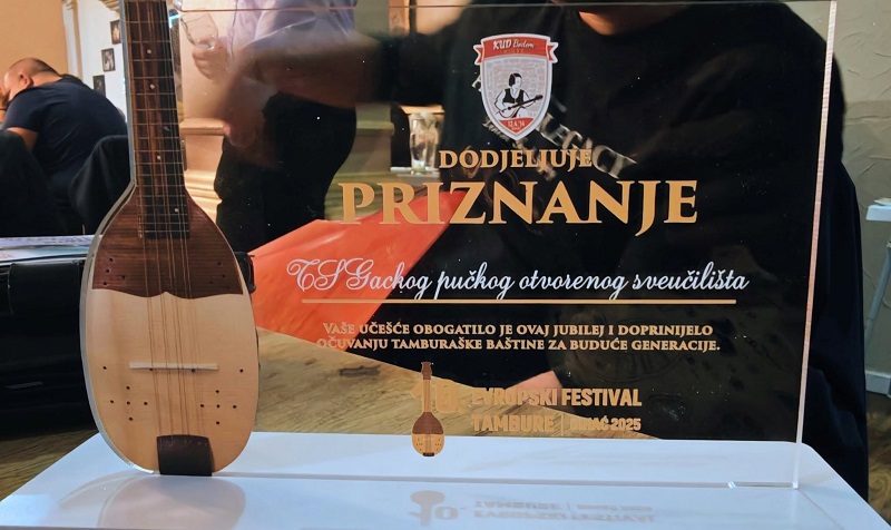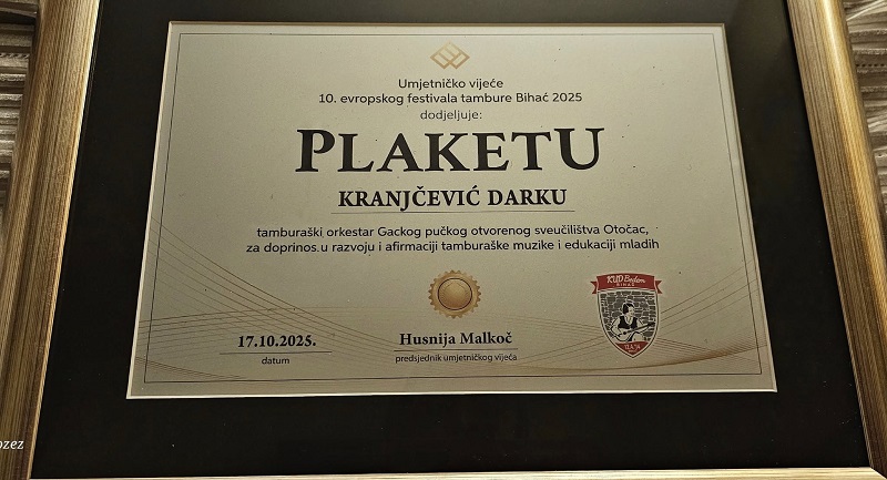 Tamburaški orkestar Gackog pučkog otvorenog učilišta Otočac nastupio na 10. Europskom festivalu tambure Bihać 2025 i primio plaketu za doprinos tamburaškoj glazbi