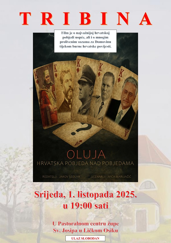 Objavljeno: 01/10/2025GOSPIĆ- U Pastoralnom centru župe svetoga Josipa u Ličkom Osiku večeras (1.listopada) s početkom u 19 sati održat će se tribina na kojoj će biti predstavljen film “Oluja, hrvatska pobjeda nad pobjedama” režisera Jakova Sedlara. Film je o najvažnijoj hrvatskoj pobjedi uopće, ali i mnogim prolivenim suzama za Domovinu tijekom burne hrvatske povijesti”.