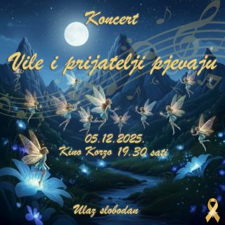 Objavljeno: 21/11/2025GOSPIĆ- Udruga “Vila za Liku” s radošću vas poziva na koncert “Vile i prijatelji pjevaju” u petak, 5. prosinca 2025. godine, u Kinu Korzo s početkom u 19.30 sati. Očekuje vas nezaboravan glazbeni doživljaj uz prekrasnu vokalnu harmoniju Malog vokalnog sastava FA dr.Ante Starčević. Bend Tajno ime na pozornici!!! Jedino što nije tajna – bit će izvrsnaaaaa svirka.
