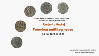 Objavljeno: 24/10/2025OTOČAC- „Rimljani u Gackoj: Putevima antičkog novca“ naziv je izložbe koja će biti otvorena u Muzeju Gacke pri Gackom pučkom otvorenom učilištu Otočac u petak, 24. listopada u 19 sati. Izložba se bavi razdobljem antike tijekom kojeg je Gacka bila dio Rimskog Carstva, a Rimljani su na ovom prostoru ostavili brojne tragove sačuvane i dandanas. Osim ostataka rimskog kamenoloma i svetišta posvećenih bogu Mitri o boravku Rimljana u Gackoj svjedoči i rimski novac. Oko 200 antičkih novčića sačuvano je u numizmatičkoj zbirci Muzeja Gacke, a izdvojeni primjerci novca iz 3. i 4. stoljeća bit će predstavljani na ovoj izložbi. Izložba ne donosi samo priču o antičkom novcu, već i o rimskim carevima, materijalima od kojih je novac izrađen, kovnicama i putevima kojima je novac dolazio do Gacke i putovao Rimskim Carstvom. Izložba će biti otvorena u izložbenoj dvorani na katu Gackoga pučkog otvorenog učilišta Otočac, a ostaje otvorena do 10. prosinca 2025. godine.