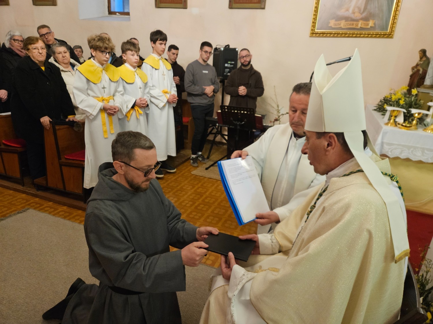 Dragi brate Marinko, tvoj put upravo to potvrđuje. Kao franjevac, živio si franjevačku karizmu, izgrađivao se u franjevačkom zajedništvu. A onda te Gospodin, kroz godine razlučivanja i tišine, poveo putem pustinjaštva: prema dubljem ostvarenju istoga predanja. Posljednjih godina živiš u Donjem Kosinju, u skrovitosti, molitvi i pokori, poziv koji danas dobiva svoj pečat u doživotnim zavjetima.