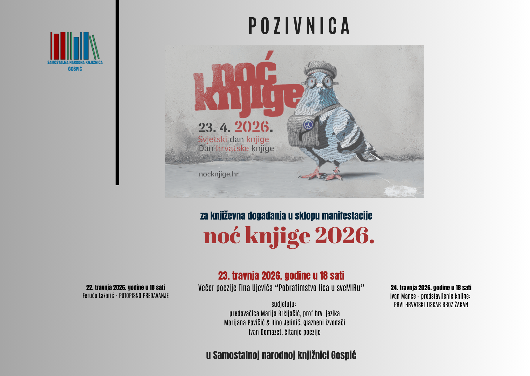 Objavljeno: 14/04/2026U Samostalnoj narodnoj knjižnici Gospić održat će se niz književnih događanja u sklopu manifestacije Noć knjige 2026, povodom Svjetskog dana knjige i Dana hrvatske knjige.