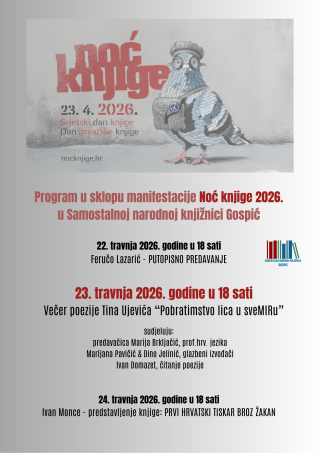 Objavljeno: 21/04/2026Samostalna narodna knjižnica Gospić i ove se godine uključuje u nacionalnu manifestaciju Noć knjige, koja se održava povodom Svjetskog dana knjige i Dana hrvatske knjige. Program će se odvijati kroz tri dana, od 22. do 24. travnja 2026., a donosi raznolika događanja za ljubitelje knjige, putopisa i poezije.