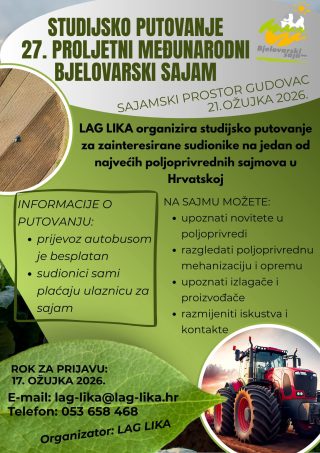 Objavljeno: 10/03/2026Za sve OPG-ovce i poljoprivrednike s područja LAG Lika organizira se studijsko putovanje na 27. Proljetni međunarodni Bjelovarski sajam, koji će se održati 21. ožujka 2026. godine u Gudovcu.
