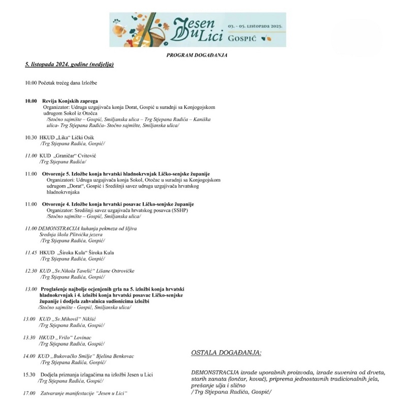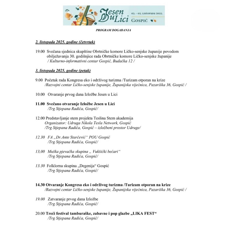 Objavljeno: 30/09/2025GOSPIĆ- U petak 3.listopada s početkom u 11 sati službeno će svoja vrata otvoriti ovogodišnja Jesen u Lici. U prilozima pogledajte kompletan raspored svih izložbenih dana.