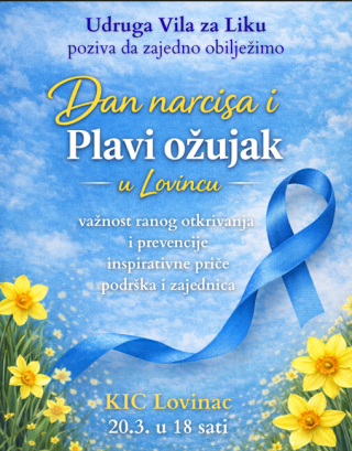 Objavljeno: 18/03/2026Udruga Vila za Liku organizira obilježavanje Dana narcisa i Plavog ožujka koje će se održati u četvrtak, 20. ožujka 2026. godine u Kulturno informativnom centru Lovinac, s početkom u 18 sati.