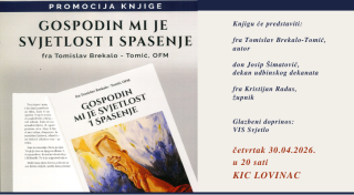 Objavljeno: 28/04/2026Kulturno-informativni centar Lovinac poziva vas na predstavljanje knjige „Gospodin mi je svjetlost i spasenje“ autora fra Tomislava Brekala – Tomića, koje će se održati u četvrtak, 30. travnja 2026. godine s početkom u 20 sati