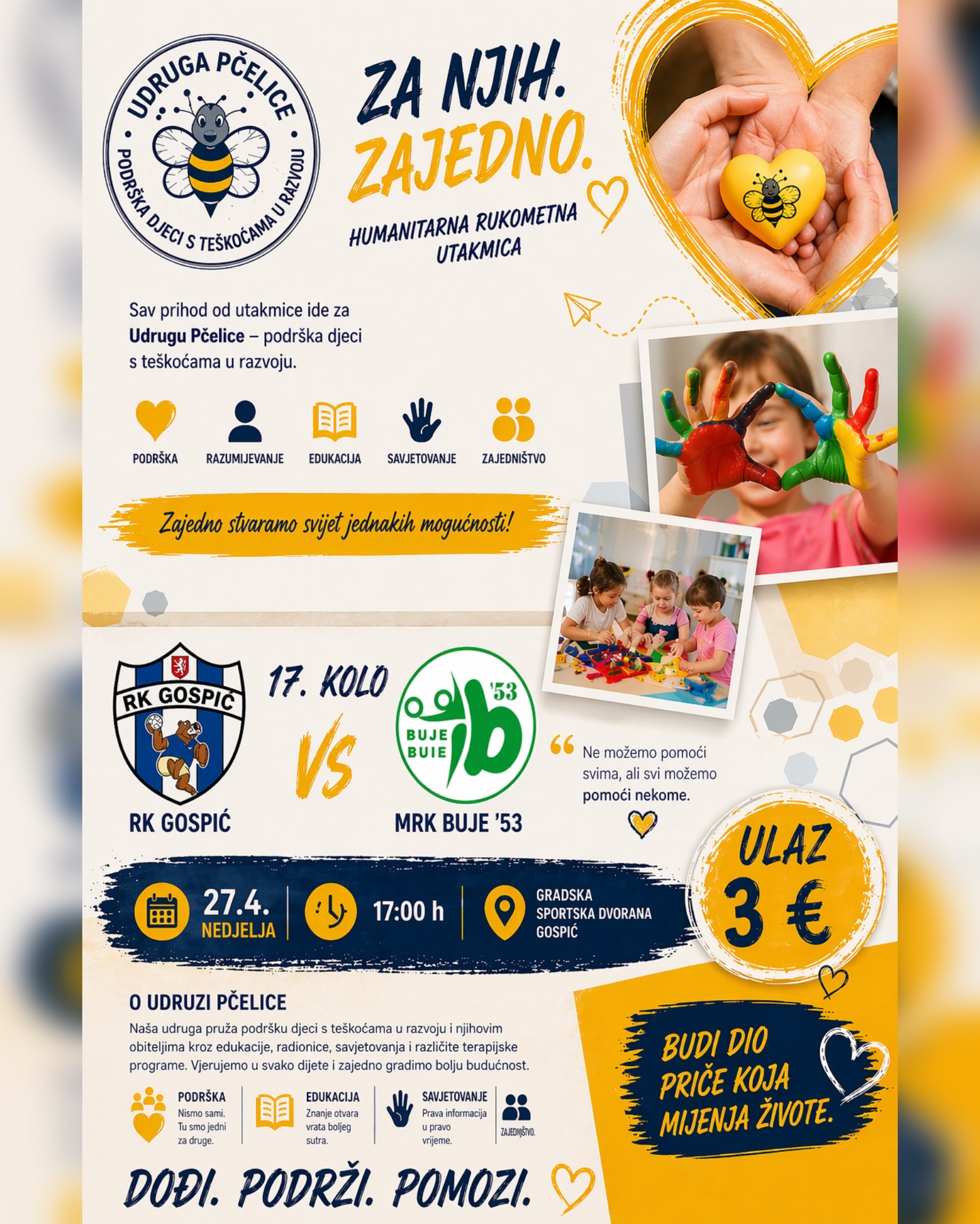 Objavljeno: 23/04/2026Rukometni klub Gospić ove nedjelje organizira utakmicu koja nadilazi sportski značaj i nosi snažnu humanitarnu poruku. Susret protiv MRK Buje ‘53 neće biti samo borba za bodove, već i prilika da se zajednica okupi oko plemenitog cilja – pomoći djeci s teškoćama u razvoju.