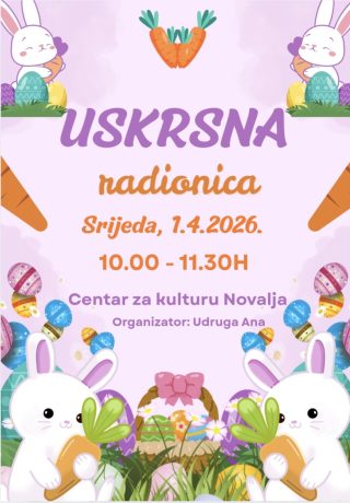 Objavljeno: 31/03/2026U susret najvećem kršćanskom blagdanu – Uskrsu, u Novalji će se održati posebna dječja kreativna radionica koja će mališanima donijeti veselje, boje proljeća i toplinu zajedničkog druženja. Udruga Ana – udruga za pomoć djeci i obiteljima poziva svu djecu da se pridruže Uskrsnoj radionici, koja će se održati u srijedu, 1. travnja 2026. godine, od 10.00 do 11.30 sati u Centru za kulturu Novalja.