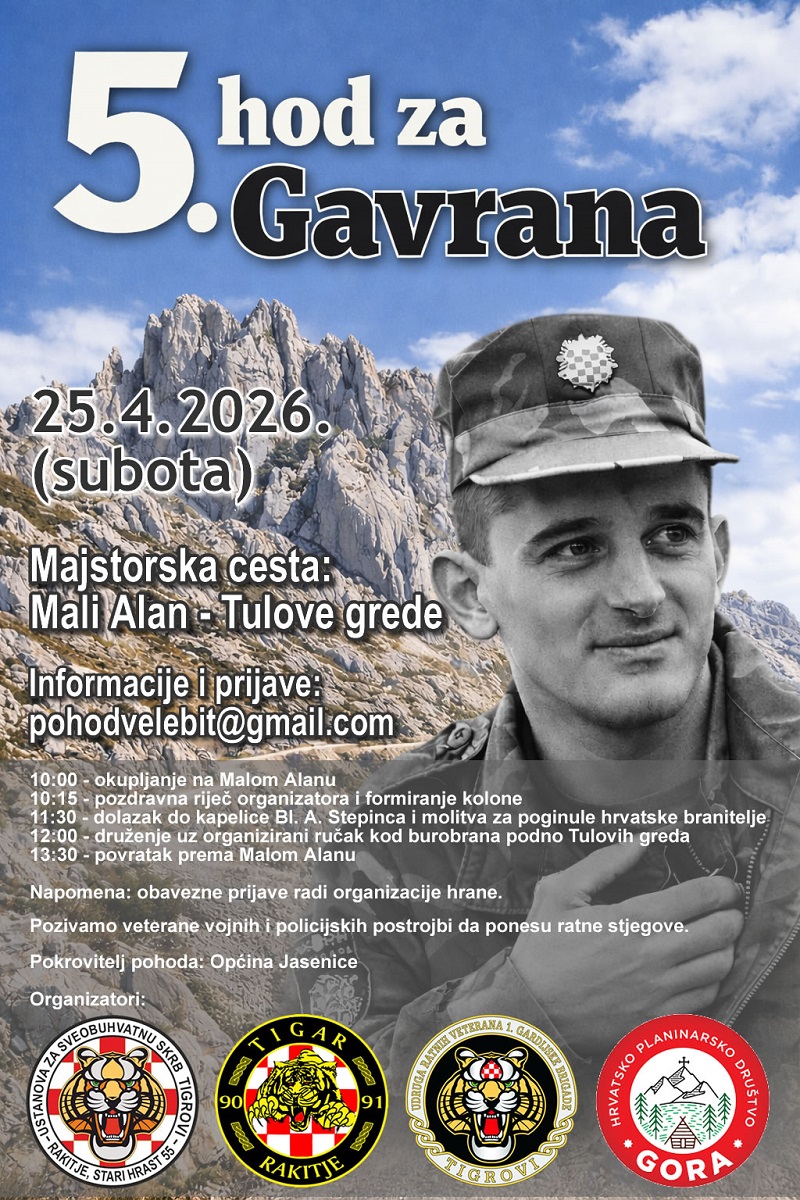 Objavljeno: 15/04/2026U organizaciji Ustanove za sveobuhvatnu skrb Tigrovi, Udruge Tigar 90.- 91.Rakitje, Udruge ratnih veterana 1.gardijske brigade Tigrovi i Hrvatskog planinarskog društva Gora, te pod pokroviteljstvom općine Jasenice, u subotu 25.travnja održat će se 5. hod za Gavrana.