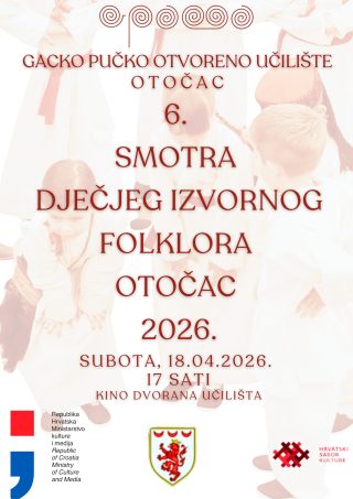 Objavljeno: 08/04/2026Gacko pučko otvoreno učilište Otočac organizira 6. Smotru dječjeg izvornog folklora, koja će se održati 18. travnja 2026. (subota) u velikoj dvorani Učilišta, s početkom u 17:00 sati.