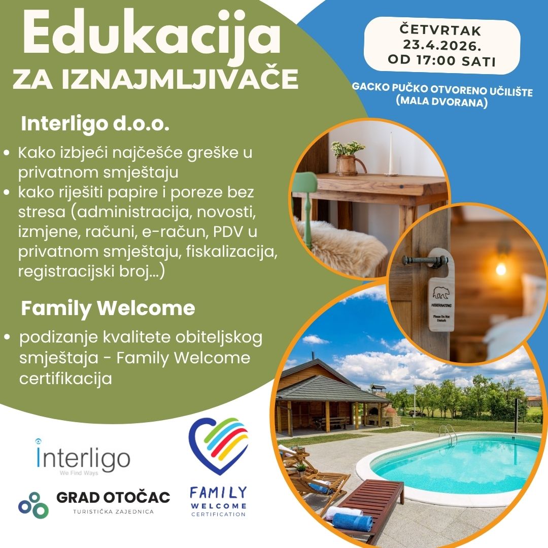 Edukacija će se održati u maloj dvorani Gackog pučkog otvorenog učilišta Otočac u četvrtak 23. travnja 2026. s početkom u 17:00 sati. Edukacija je besplatna za sve zainteresirane iznajmljivače kao i one koji to tek žele postati ali i sve ostale nositelje turističkih ponuda.
