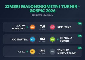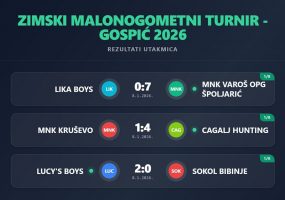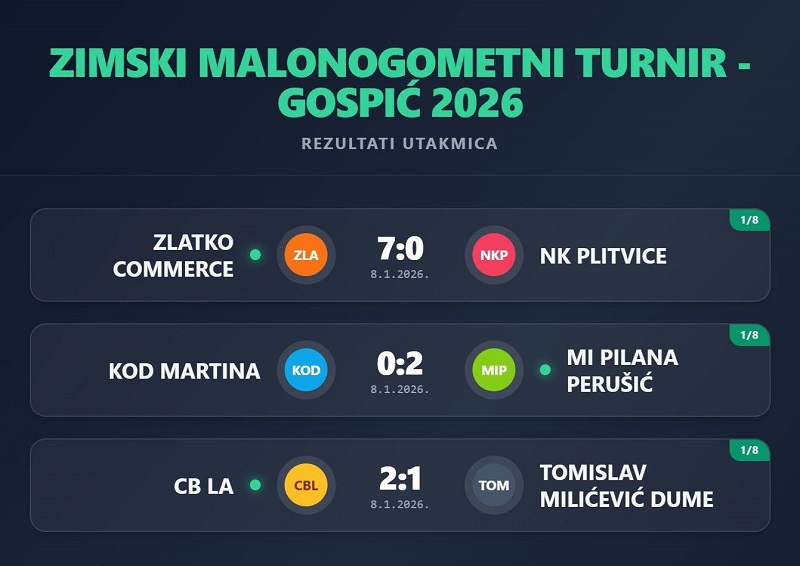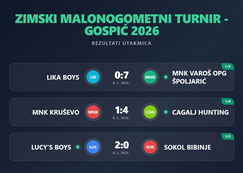 Objavljeno: 09/01/2026GOSPIĆ- U susretima osmine finala Zimskog malonogometnog turnira Gospić 2026.postignuti su sljedeći rezultati: