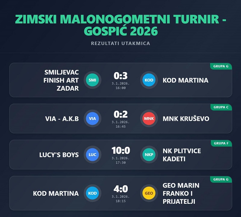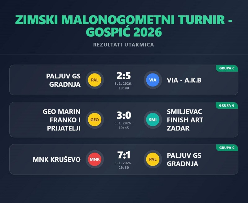 Objavljeno: 04/01/2026GOSPIĆ- I drugi dan Zimskog malonogometnog turnira Gospić 2026 donio je niz odličnih utakmica i malonogometnih poteza. Postignuti su sljedeći rezultati: Smiljevac finish Art Zadar- Kod Martina 0:3, VIA AKB- MNK Kruševo 0:2, Lucys boys- NK Plitvice kadeti 10:0, Kod Martina- Geo Marin Franko i prijatelji 4:0, Paljuv GS gradnja- VIA AKB 2:5, Geo Marin Franko i prijatelji- Smiljevac finish art Zadar 3:0 i MNK Kruševo- Paljuv GS gradnja 7:1. Današnji (4.siječnja) program starta u 15 sati,a ovo su parovi i raspored: