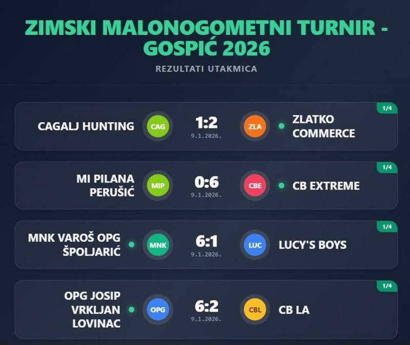 Objavljeno: 10/01/2026GOSPIĆ- Nakon susreta ćetvrtzavršnice poznati su polufinalni parovi Zimskog malonogometnog turnira Gospić 2026. Sinoć u četvrtfinalnim susretima postignuti su ovi rezultati: Cagalj hunting-Zlatko commerce 1:2, MI pilana Perušić- CB Extreme 0:6, MNK Varoš OPG Špoljarić- Lucys boys 1:6 i OPG Josip Vrkljan Lovinac-CB LA 6:2. Danas u polufinalnim susretima sastaju se od 18:45 Zlatko commerce-OPG Josip Vrkljan Lovinac, a od 20:30 CB Extreme-MNK Varoš OPG Špoljarić. Osim toga igra se i nekoliko revijalnih utakmica, a ovo je cjeloviti današnji raspored: