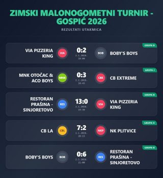 Objavljeno: 03/01/2026GOSPIĆ- Susretima 1.kola počeo je Zimski malonogometni turnir Gospić 2026. U grupi B odigrana su tri susreta: Via pizzeria King- Bobys boys 0:2, Restoran Prašina Sinjoretovo- Via pizzeria King 13:0 i Bobys boys-Restoran Prašina Sinjoretovo 0:6. U grupi J CB Extreme je bio bolji od ekipe MNK Otočac& Aco boys 3:0, dok je u grupi H CB LA bio bolji od NK Plitvice 7:2. Turnir se nastavlja danas, a ovo je raspored: