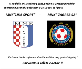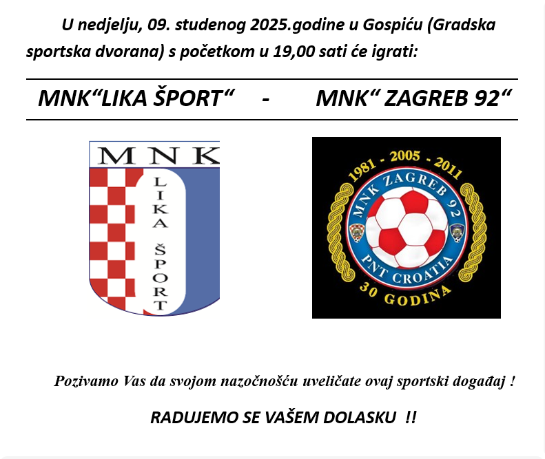 Objavljeno: 07/11/2025GOSPIĆ- U sklopu drugog kola regije Centar druge hrvatske malonogometne lige u nedjelju 9.studenoga od 19 sati u sportskoj dvorani u Gospiću sastaju se Lika šport i Zagreb 92.