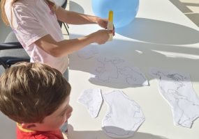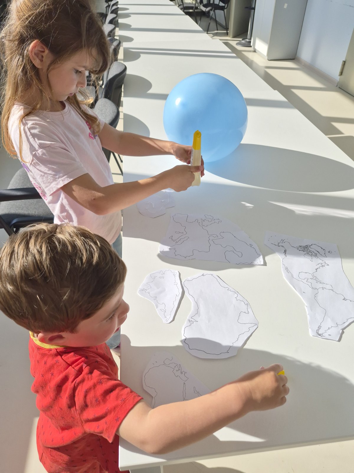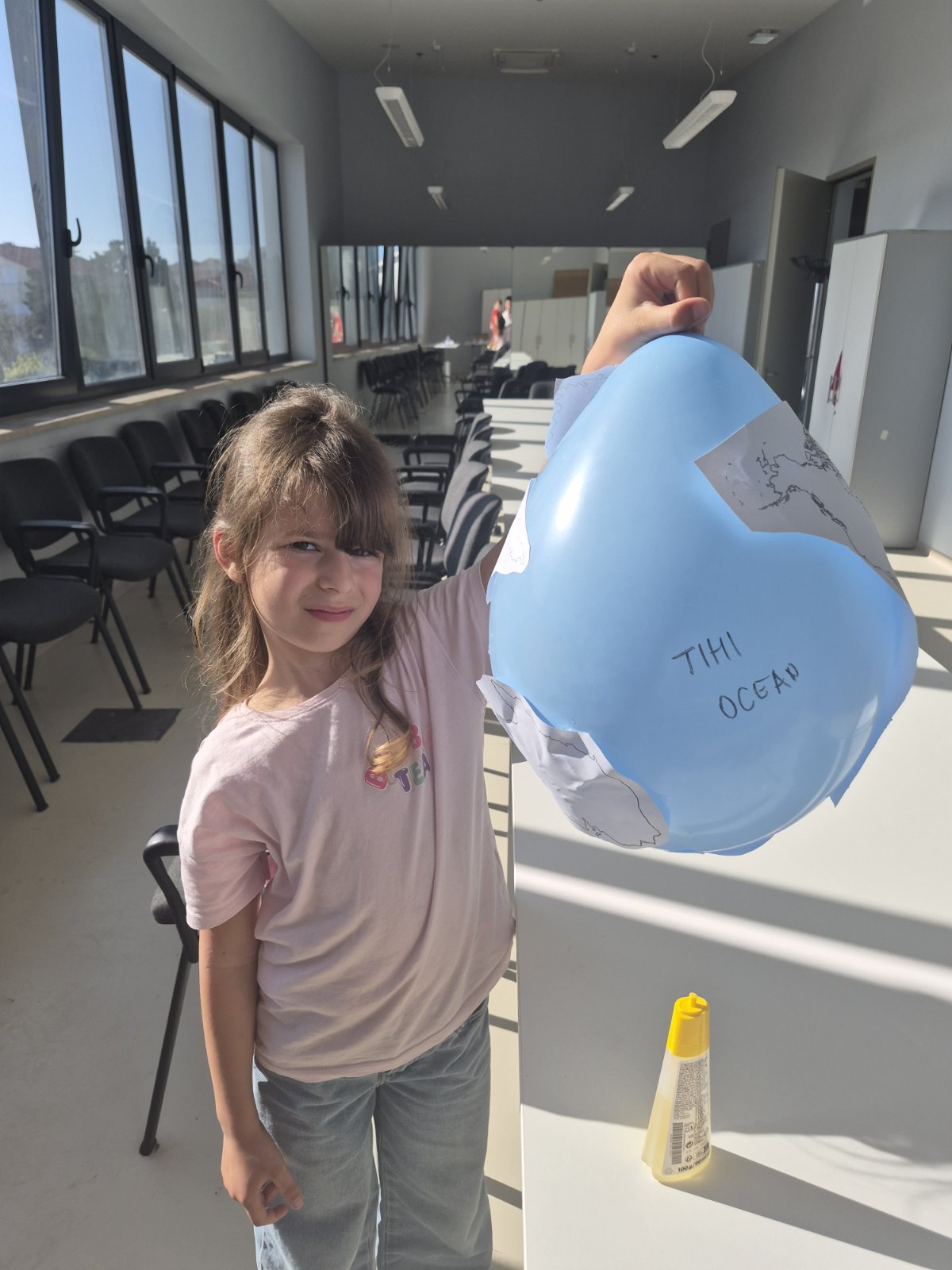 Prvi dio radionice odnosio se na izradu planete Zemlje. Djeca su napuhala balon plave boje, a zatim su izrezivala kontinente i lijepila ih na balon. Na taj su način kroz praktičan i zabavan rad učila kako izgleda naša planeta, gdje se nalaze kopno, mora i oceani te zašto je važno brinuti o prirodi.